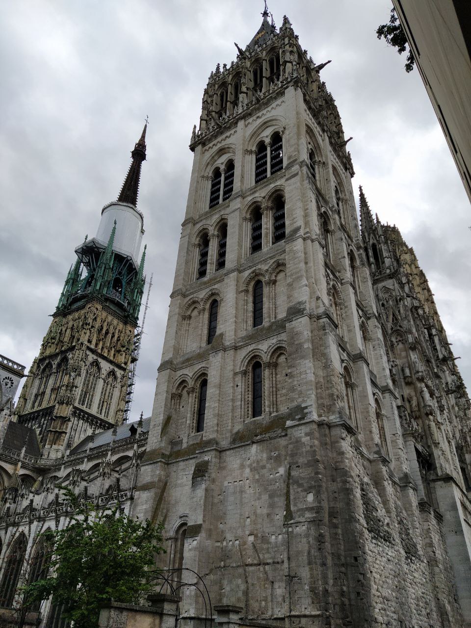 En 1145 se empezó a construir una torre gótica, la torre norte, Torre de Saint-Romain. Pero en el siglo XIII la catedral románica se destruyó por el fuego y se empezaron las obras para construir una nueva, ya en estilo gótico. La torre sur, Tour de Beurre, no se construyó hasta el siglo XV. Se llama así porque su construcción se pagó con el dinero que recibía la Iglesia por poder comer mantequilla durante la Cuaresma.