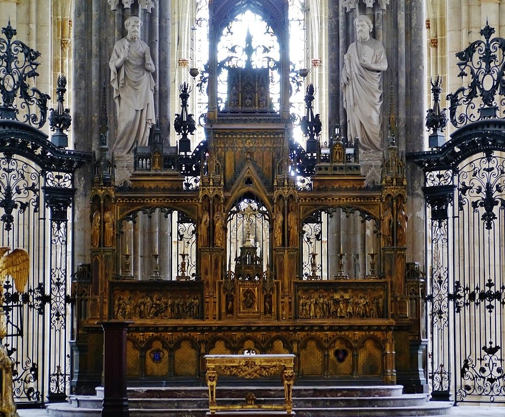 Los pilares y los arcos están a su vez, decorados con doseletes de los que cuelgan columnillas más finas.