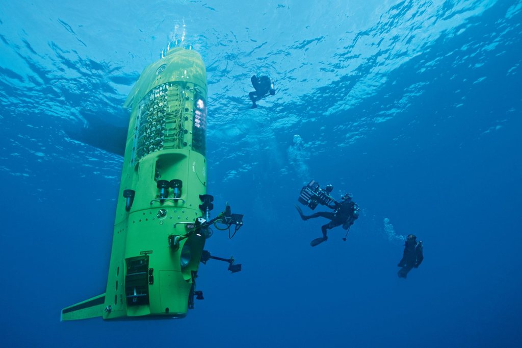 Hicieron varias pruebas antes, descendiendo en otros lugares, para comprobar que toda al maquinaria, cámaras y focos funcionaran perfectamente. En la imagen los buzos comprueban desde el exterior. Bajaron hasta más de los 8000 m.