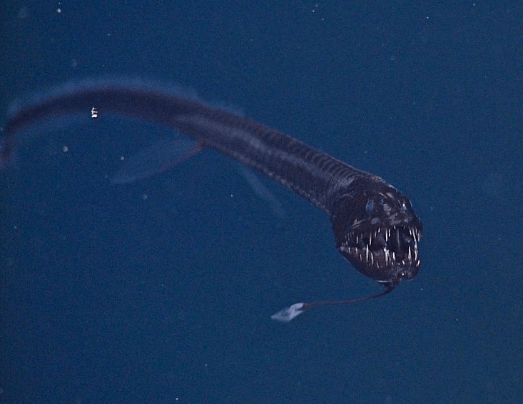 Dragón negro. Las hembras miden unos 25 cm, pero los machos son mucho más pequeños, unos 8 cm y solo viven lo suficiente para aparearse. Tienen unos fotóforos para dispersar la luz y sus dientes son transparentes, de forma que pueden mantener la boca abierta mientras cazan.