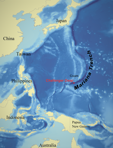 La Fosa de las Marianas es una depresión del fondo marino que se encuentra en el Océano Pacífico occidental, a unos 200 km al este de las islas Marianas, y es el área más profunda de los océanos de la Tierra. Tiene forma de media luna y mide unos 2550 km de largo por unos 69 km de ancho. Alcanza una profundidad de 11.050 metros en el extremo sur de un pequeño valle en su fondo, conocido como Abismo de Challenger. Sin embargo, algunas mediciones creen que su punto más profundo llega a los 11.034 metros.