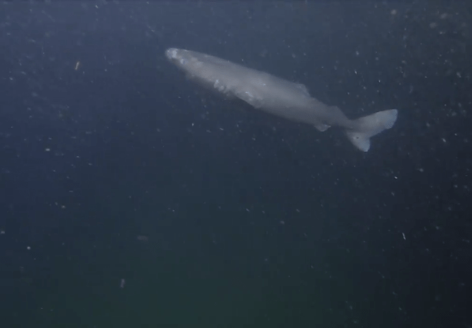 Tiburón duende. Debe su color rosa a la sangre que se acumula por debajo de su piel traslúcida. Mide unos cinco metros. Vive hacia 1300 m.