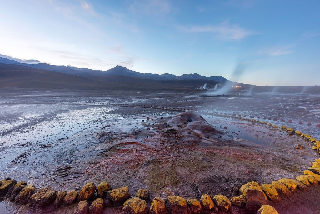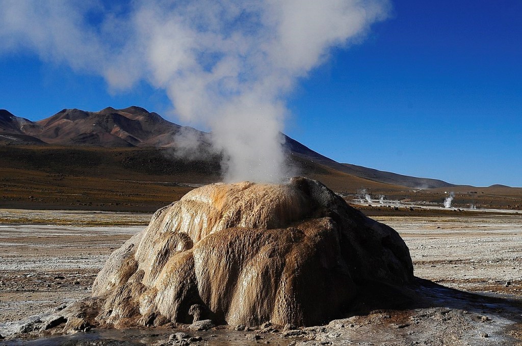Vistas de las fumarolas de los géiseres delante del Monte Soquete. Al fondo los Andes. se encuentran a están a una altura de 4.200 m sobre el nivel del mar, por tanto, son los más altos del mundo.