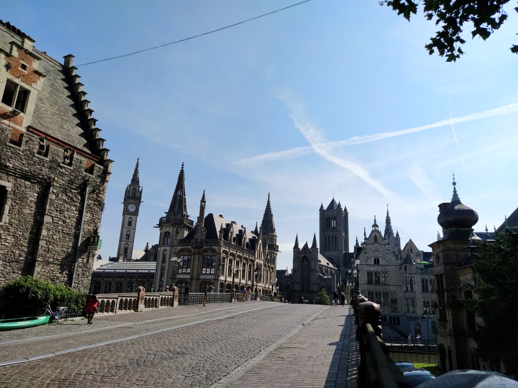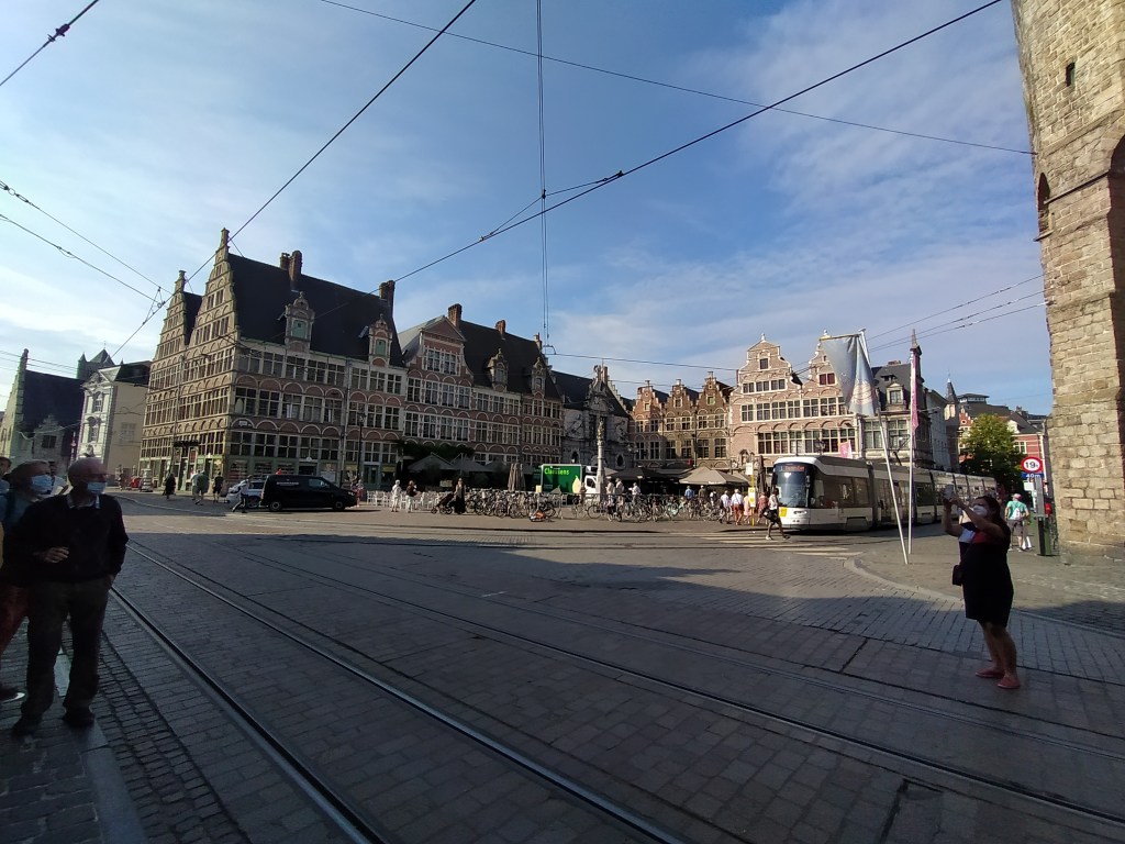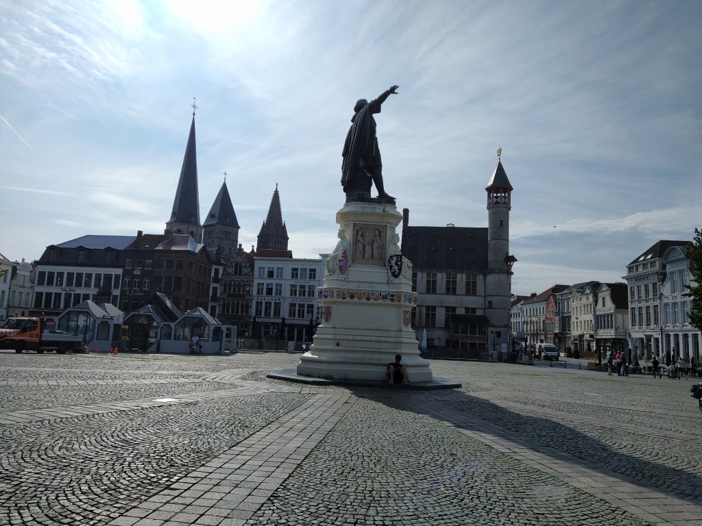 la estatua de Jacob van Artevelde preside la plaza. Señala hacia Inglaterra, ya que logró anular el boicot a la importación de lana inglesa en la Guerra de los Cien Años entre Inglaterra y Francia en el siglo XIV. El edificio del fondo, el más moderno de la plaza es de comienzos del siglo XX y es la casa del pueblo socialista, con el nombre de Bond Moyson.