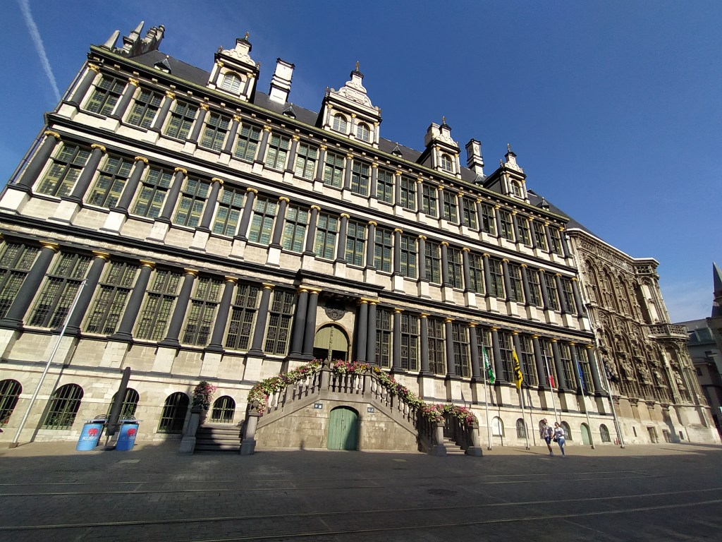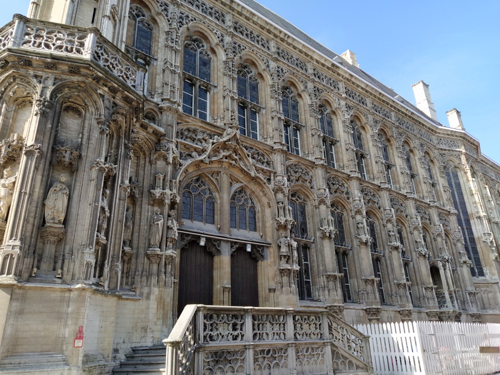 El Ayuntamiento de Gante o Stadhuis. Esta es la parte más antigua del edificio, de estilo gótico flamígero en la fachada de la calle Hoogpoort.