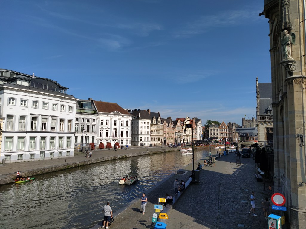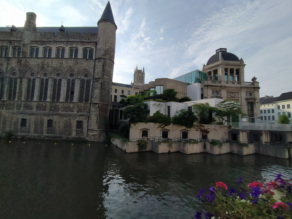 Río Lys y el antiguo edificio de la Lonja de la carne y, por detrás, de la casquería, donde se vendían restos de carne de dudosa categoría, que no se podían vender en la Lonja de la carne, a precios baratos. Hoy alberga algún restaurante y un café, el ‘t Galgenhuisje con terraza junto al río, que presume de ser el café más pequeño de Gante.