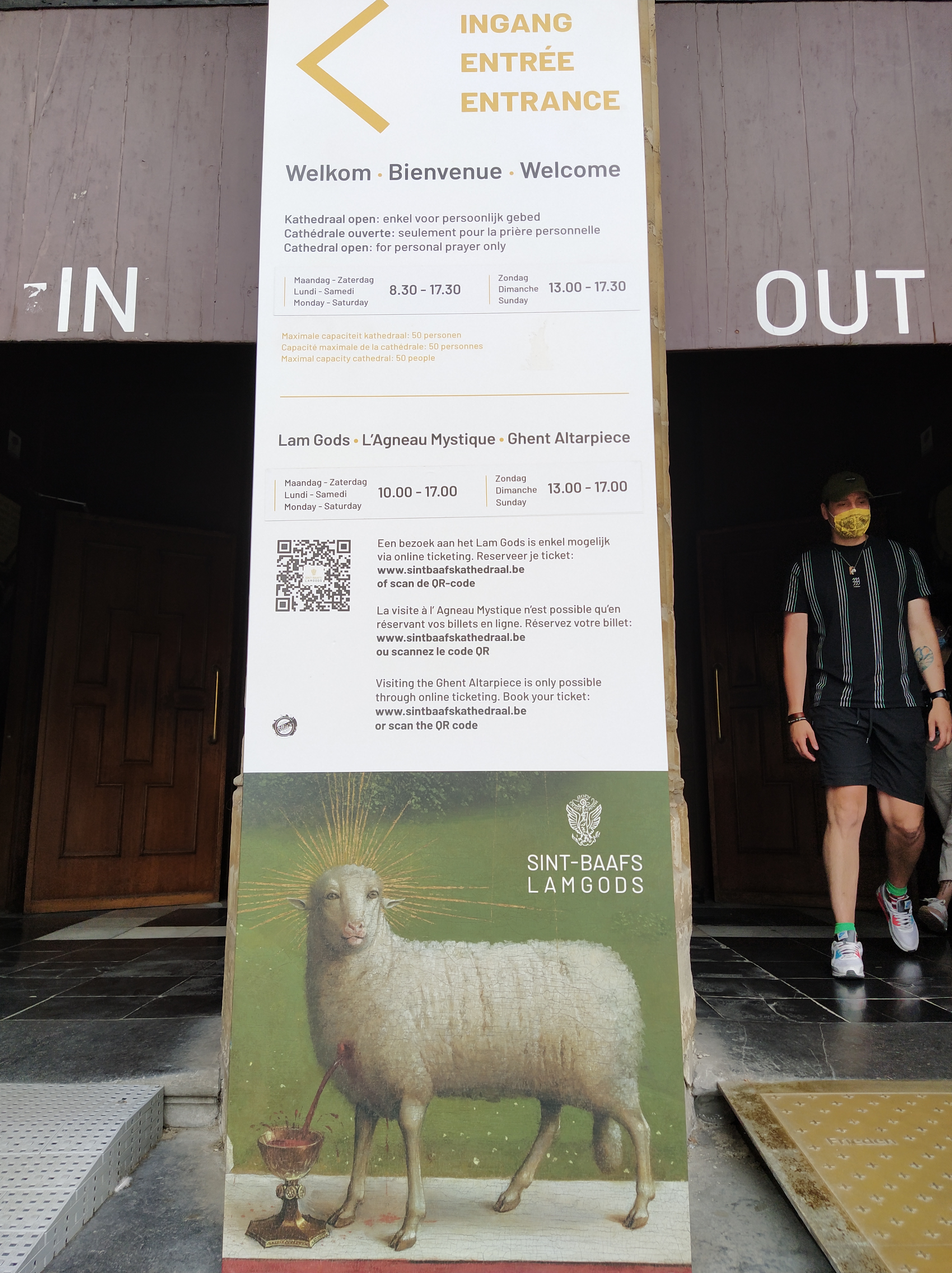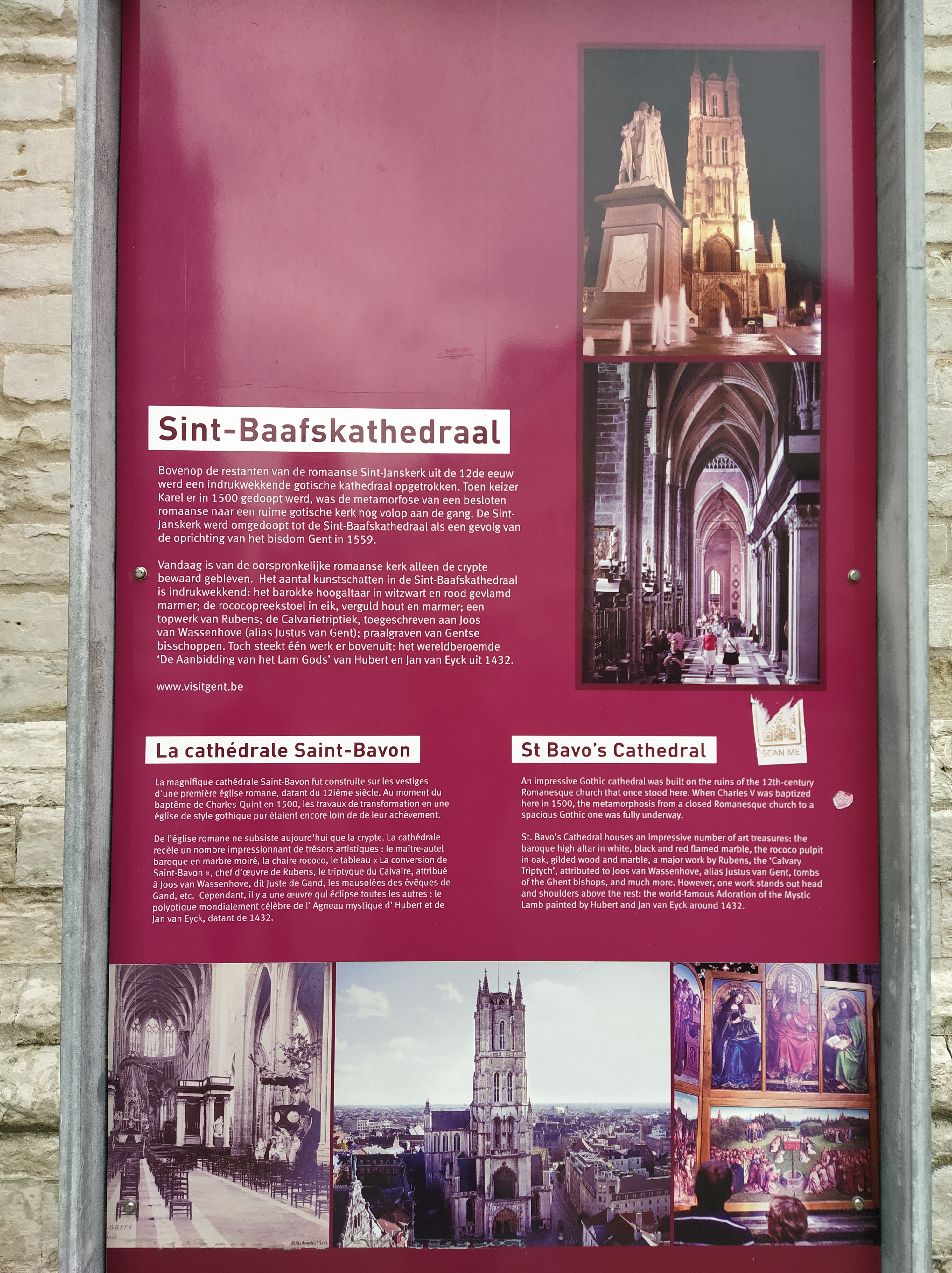 Carteles que hablan de la Historia de la catedral y de los tesoros, como la Adoración del Cordero Místico.
