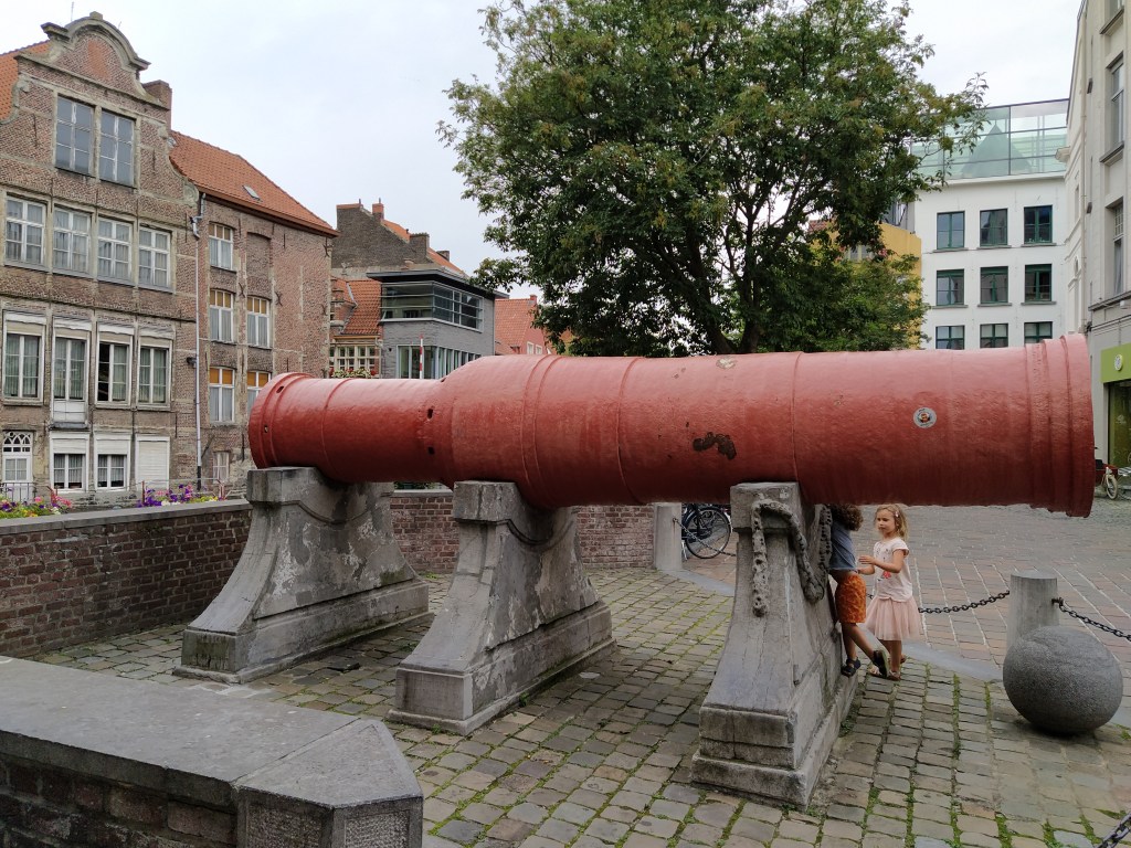 Dulle Griet. Conocido como » Margarita la Loca» . Histórico cañón gigante de hierro de color rojo, un arma del siglo XV utilizada en el asedio de Oudenaarde, pero que, según algunos, no ha sido disparado nunca.