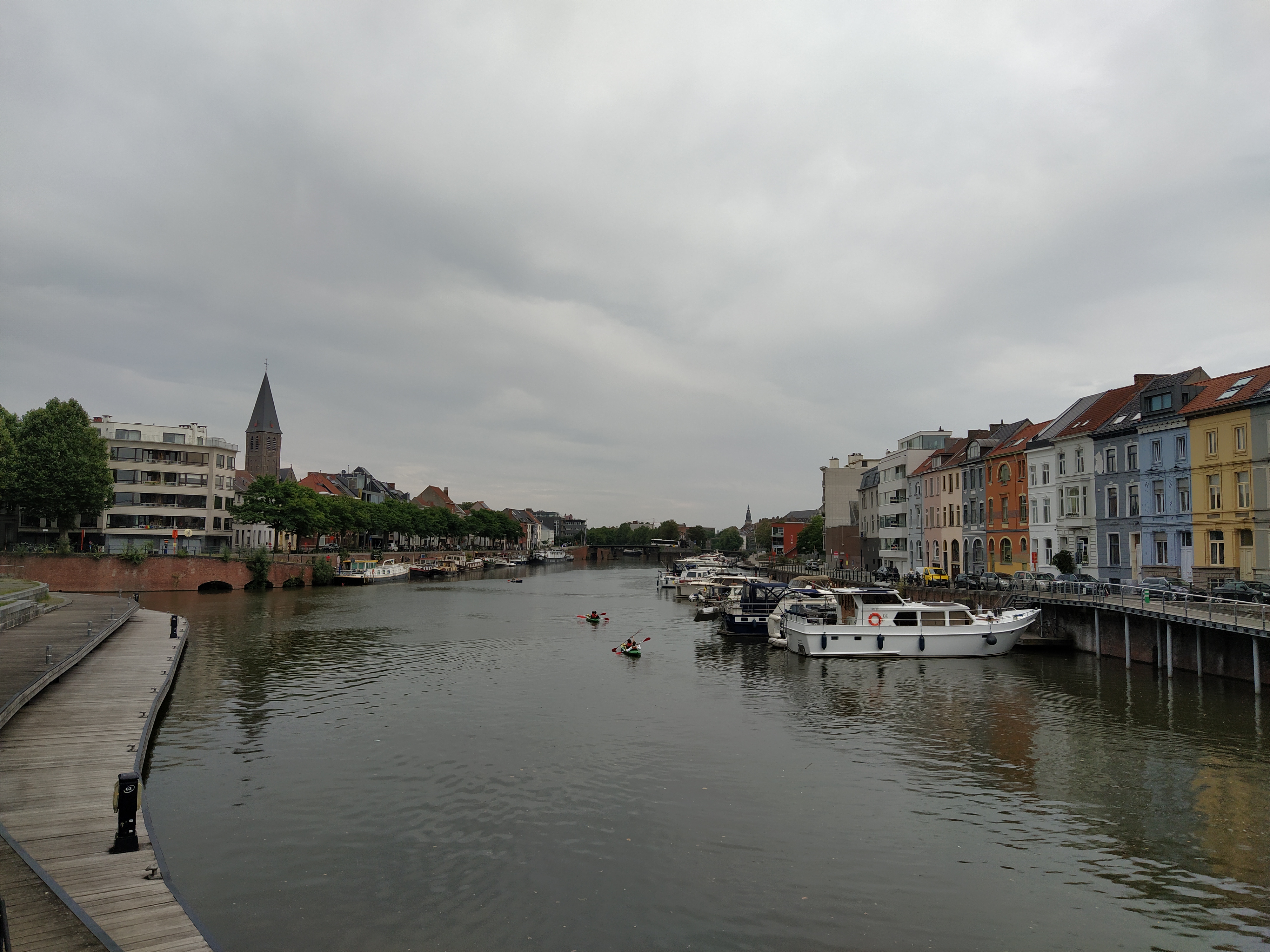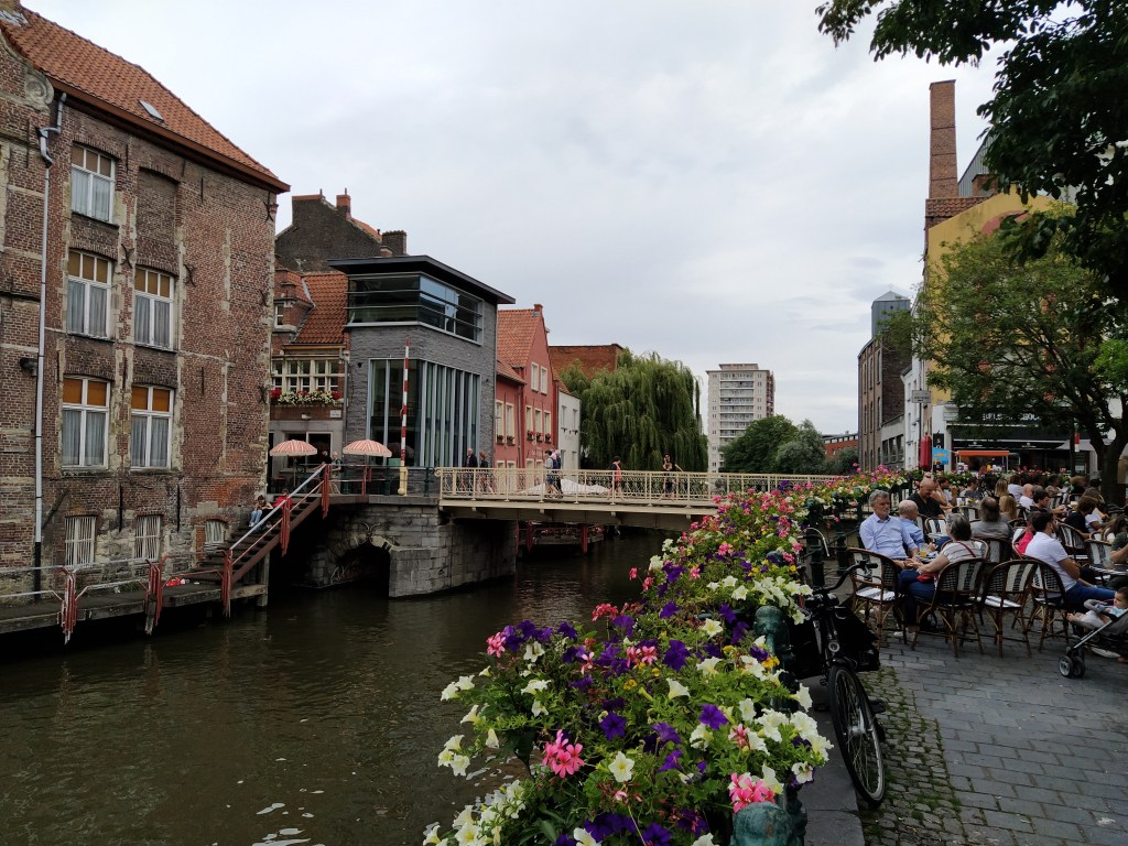 Las cafeterías y cervecerías junto al río Lys se llenan de gente. La lluvia no asusta a los paseantes.