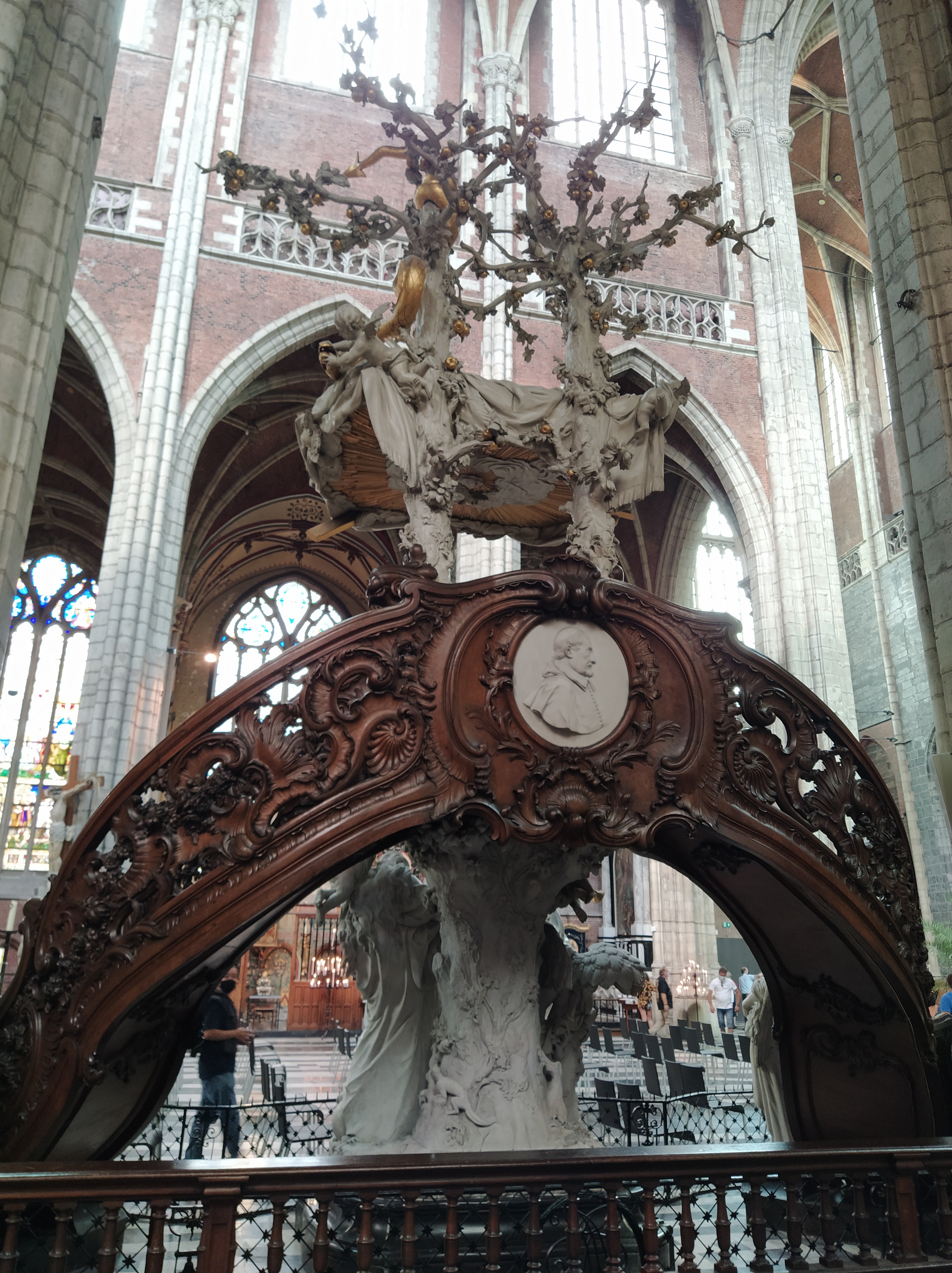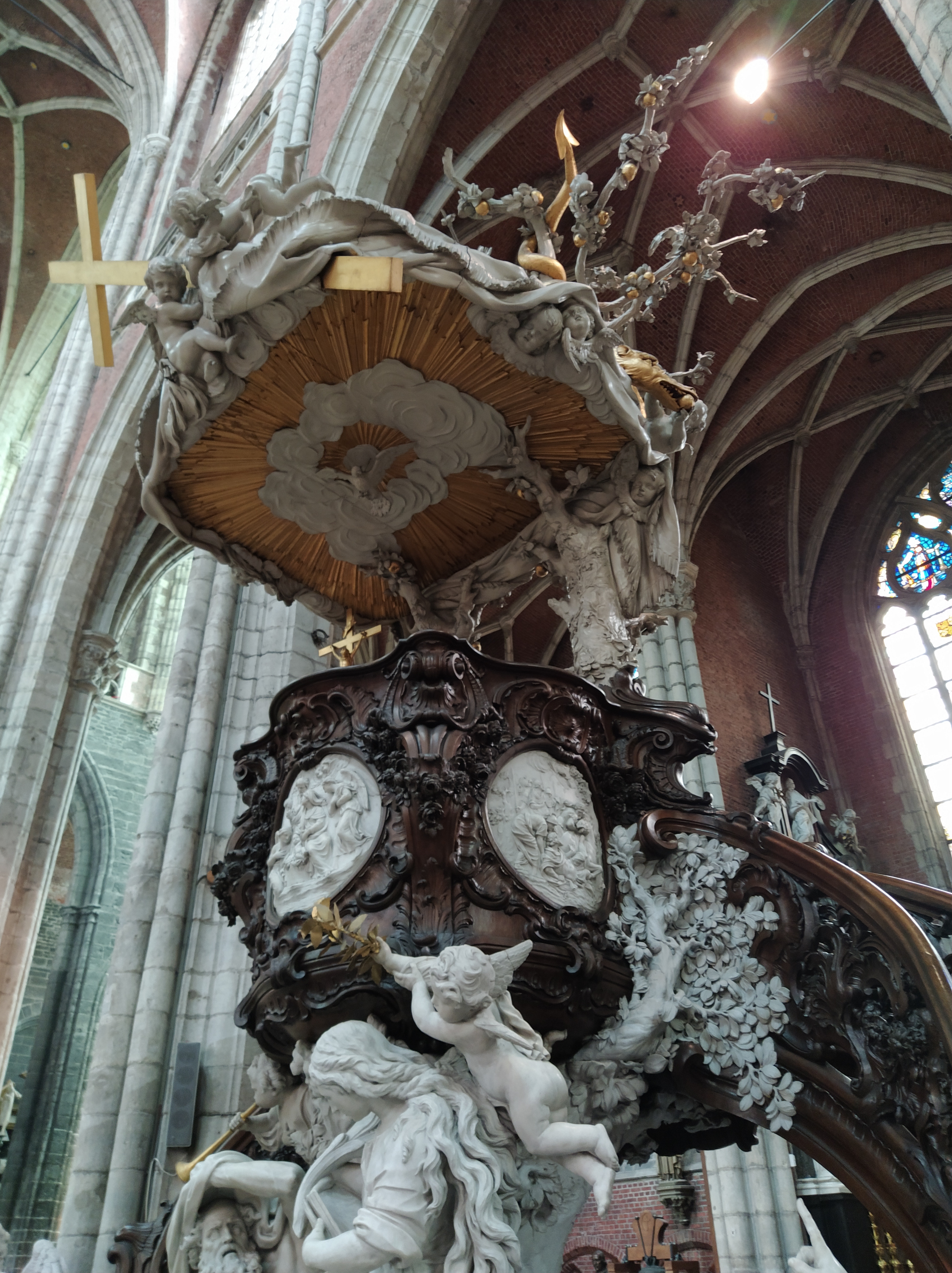 Púlpito con el grupo escultórico en mármol de Carrara y roble de Dinamarca, que representa el triunfo de la verdad sobre el tiempo. Obra de L. Delvaux del siglo XVIII.
