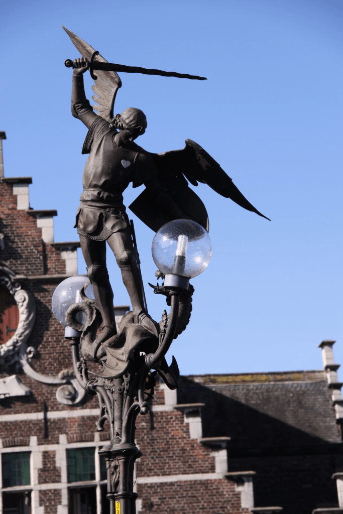 Estatua de San Miguel Arcángel, venciendo al dragón que se retuerce a sus pies. Se encuentra en el centro del puente de San Miguel.