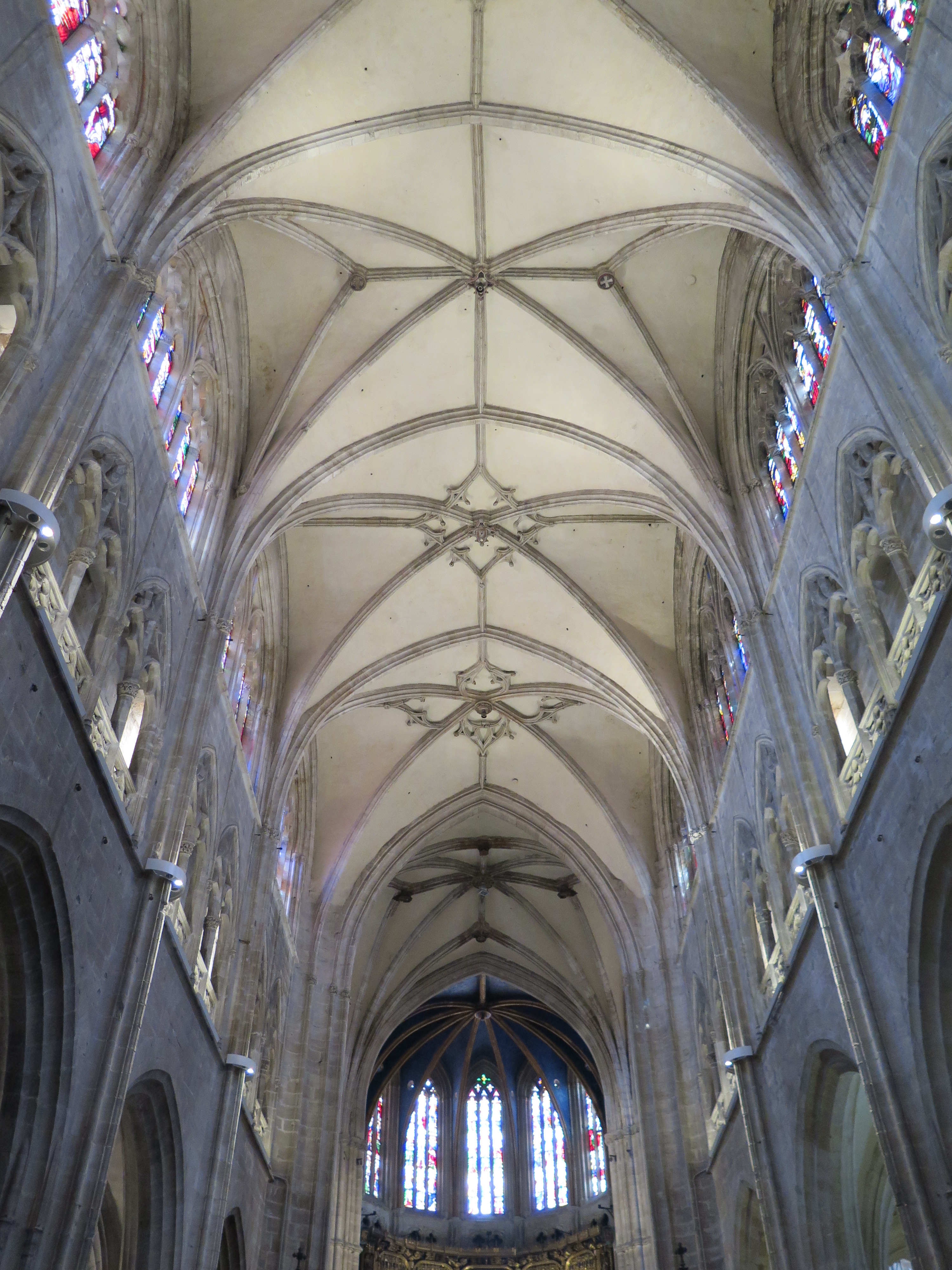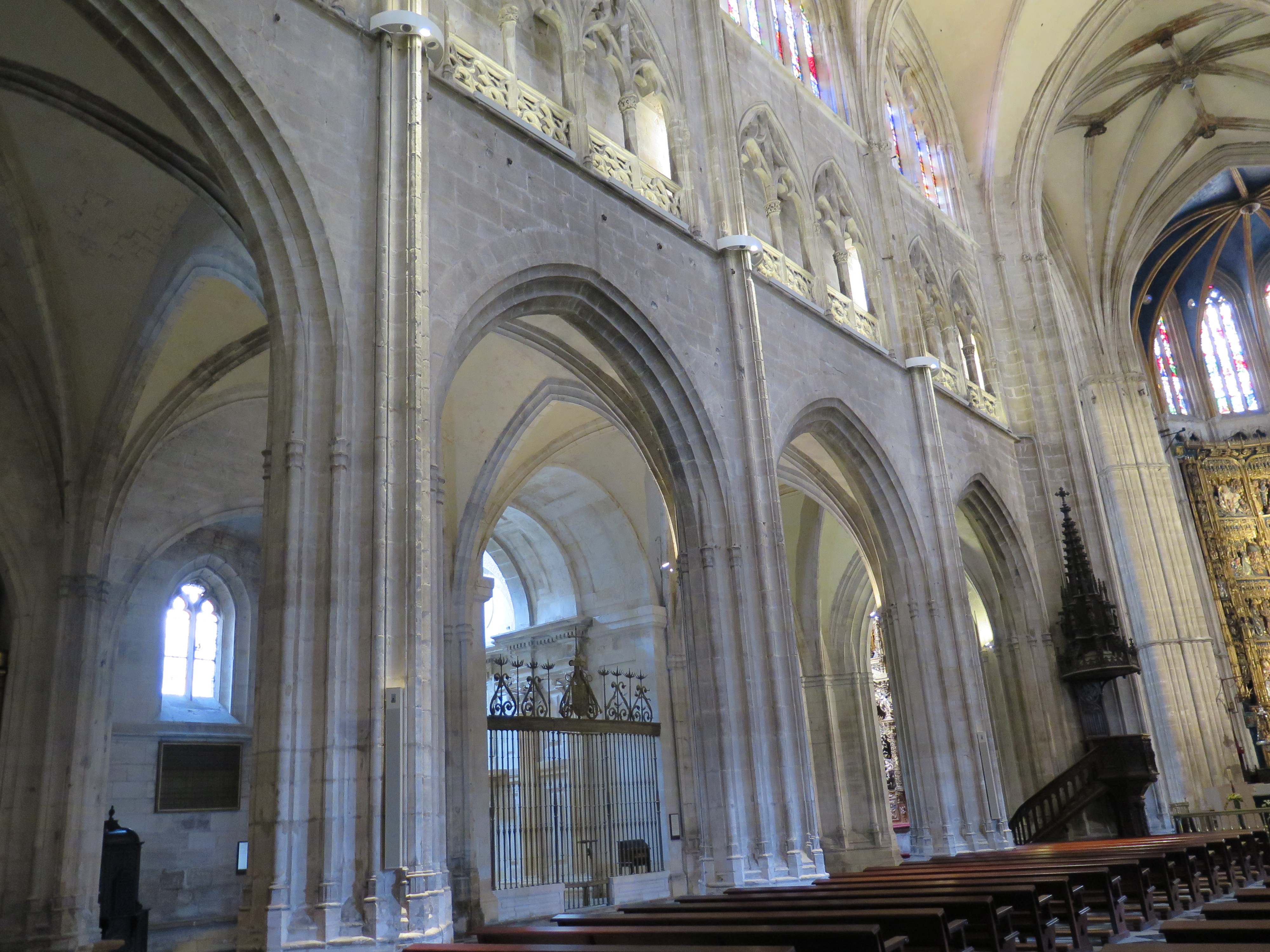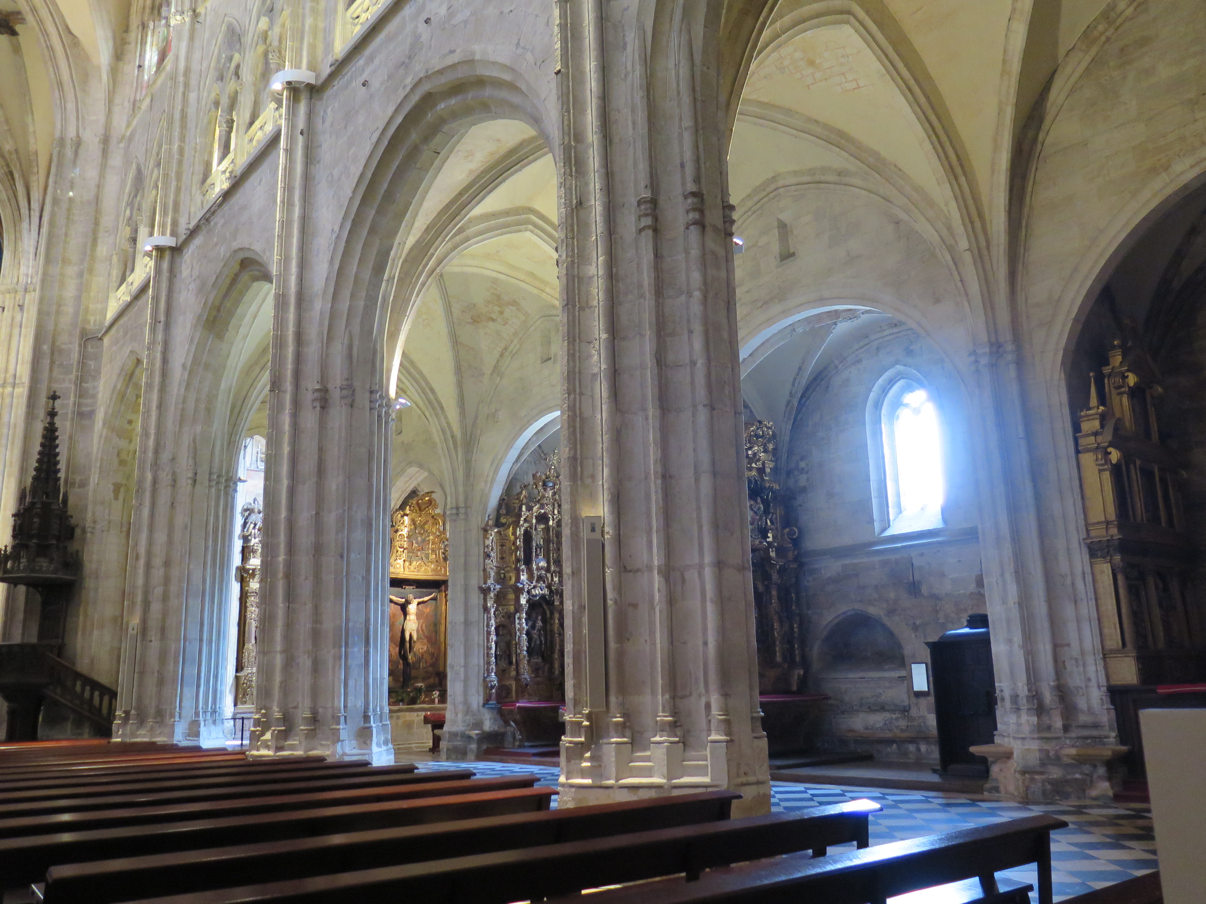 Detalles de la nave central y las laterales, con arcos ojivales, pilares con columnas adosadas y bóvedas de crucería.