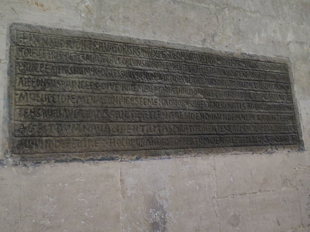 Inscripción fundacional de la fortaleza de Alfonso III, que ordenó colocar esta lápida sobre el dintel de la puerta de la fortaleza. Escrita en latín, viene a decir En el nombre de Nuestro Señor Dios, nuestro Salvador, Jesucristo, la Santísima Virgen, los doce Apóstoles, y restantes mártires, en cuyo honor fue construido este templo en el lugar del construido por el otro príncipe Alfonso, (Alfonso II), Alfonso III el Magno, junto con su esposa Jimena, para proteger con este castillo la Cámara de esta santa iglesia……