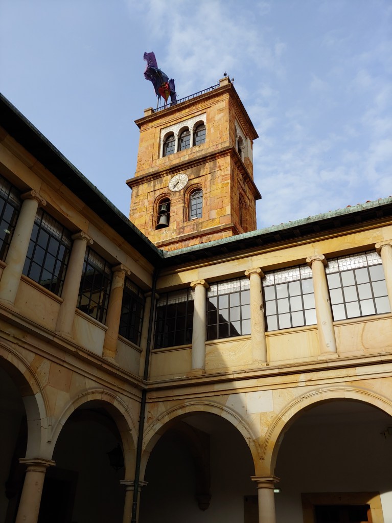 Entrada a la Universidad de Oviedo. Se puede ver el escudo heráldico de los Valdés. Fue edificada en el siglo XVI. Es Universidad pública y la única del Principado, con campus en Oviedo, Avilés y Gijón.