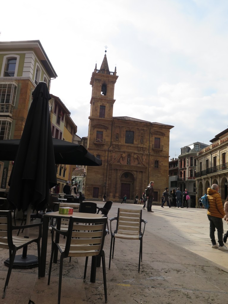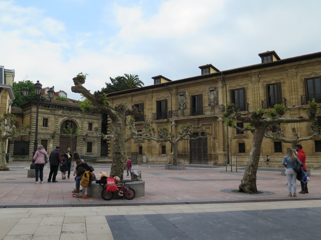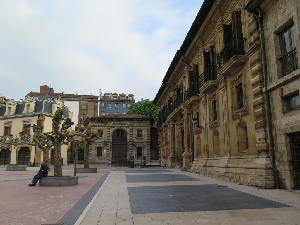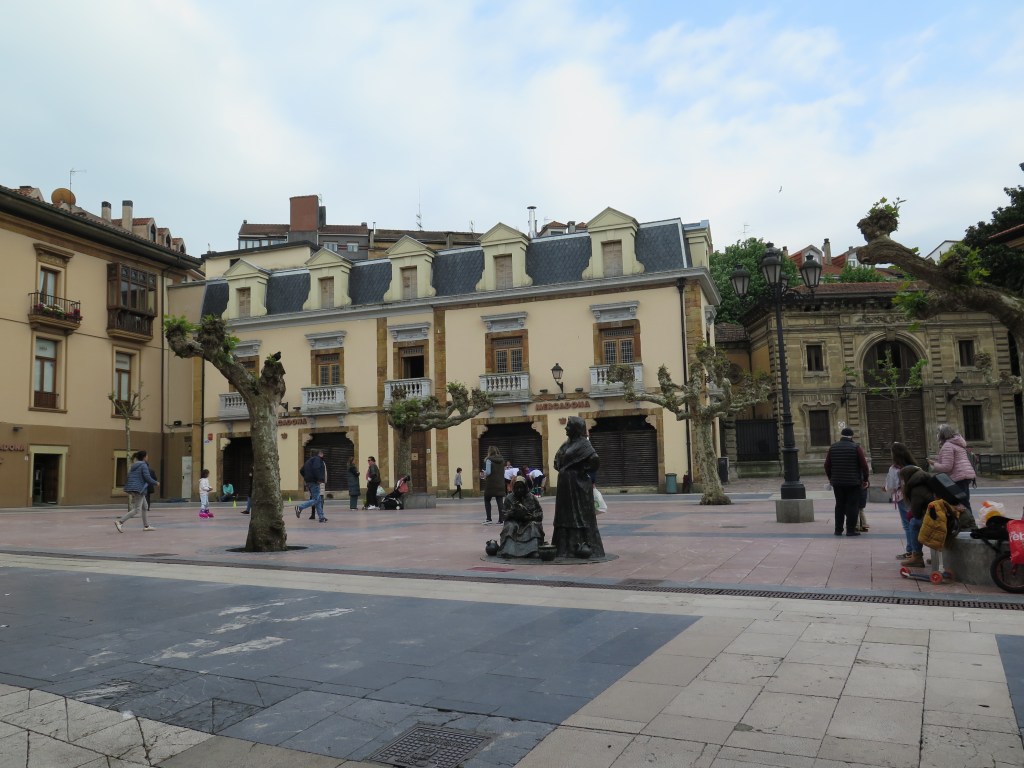 Estatua del viajero, en la Plaza Porlier. Al fondo a la izquierda, la antigua Universidad de Oviedo.