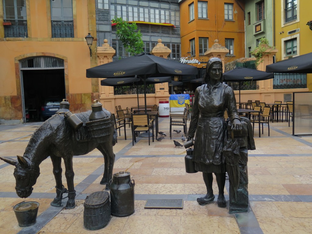 En el centro de la plaza destacan las esculturas en bronce, de la lechera con una burra, a tamaño natural.