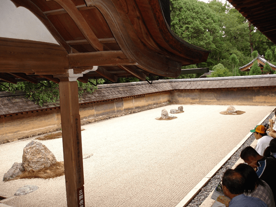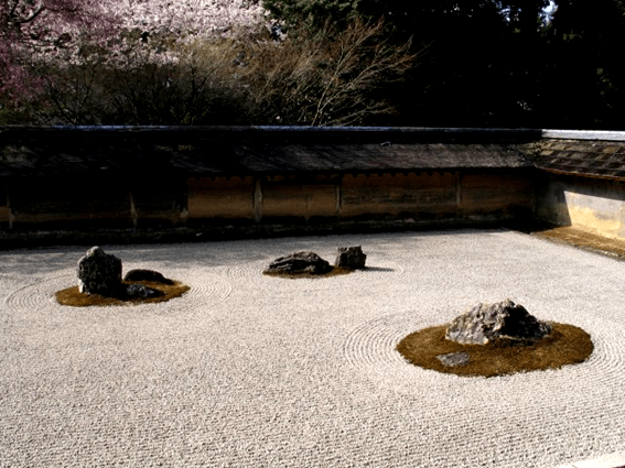Jardín seco. Algo muy típico japonés. Tanto la tierra como las piedras de decoración tienen un propósito en su colocación que busca la armonía.
