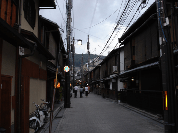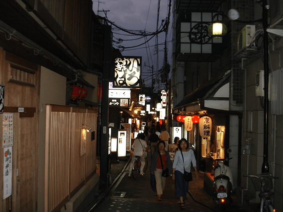 Calles estrechas con okiyas, las casas típicas donde se educaban las geishas. Esta es la calle Pontocho.